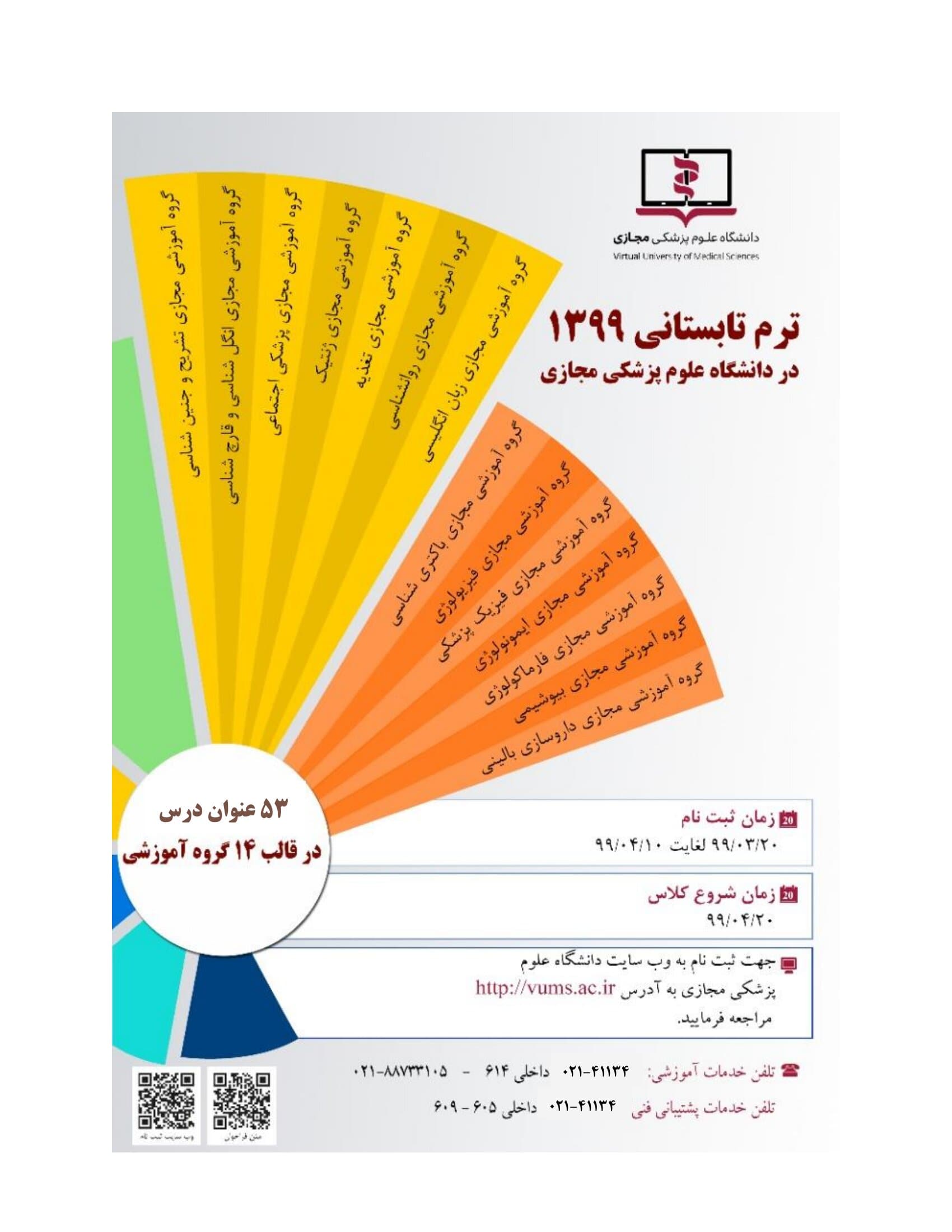 به استحضار می رشاند که با عنایت به پیشنهاد رئیس محترم دانشگاه علوم پزشکی مجازی و حمایت معاون محترم آموزشی وزارت بهداشت درمان و آموزش پزشکی طی نامه و درخواست های جمع کثیری از دانشجویان دانشگاه های علوم پزشکی کشور در خصوص تخفیف شهریه دروس ترم تابستانی مجازی 1399، دانشگاه علوم پزشکی مجازی در نظر دارد با هدف مساعدت با متقاضیان این برنامه و پشتیبانی از فرایندهای تحصیلی دانشجویان دانشگاه های علوم پزشکی کشور 53 درس مجازی ترم تابستانی 1399 را با 40 درصد تخفیف برای دانشجویان دانشگاه های علوم پزشکی سراسر کشور ارائه دهد. اطلاعیه تخفیف 40 درصدی جهت ثبت نام |