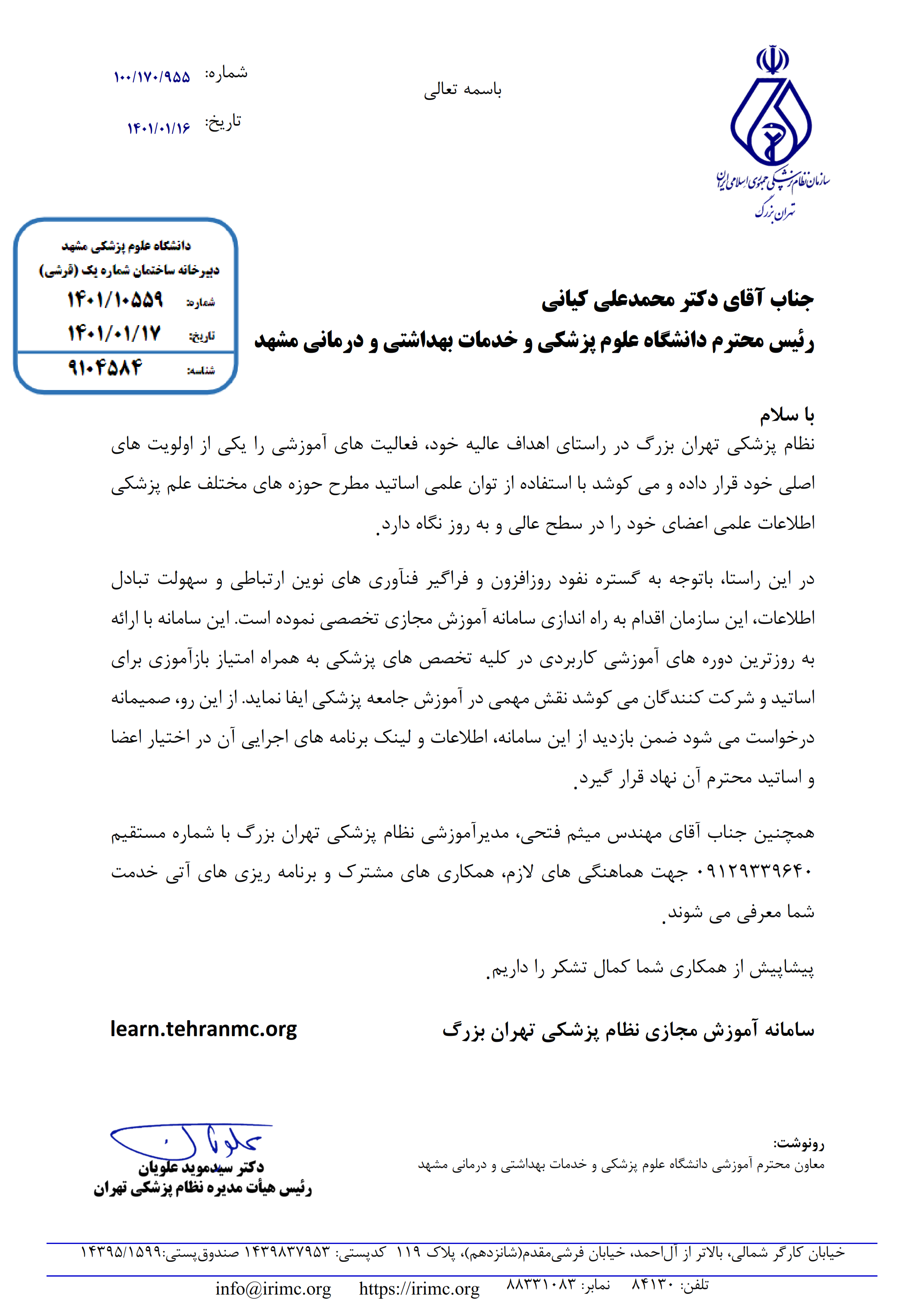 همچنین جناب آقای مهدس میثم فتحی، مدیر آموزشی نظام پزشکی تهران بزرگ با شماره مستقیم 09129339640 جهت هماهنگی های لازم، همکاری های مشترک و برنامه ریزی های آتی خدمت شما معرفی می شوند.