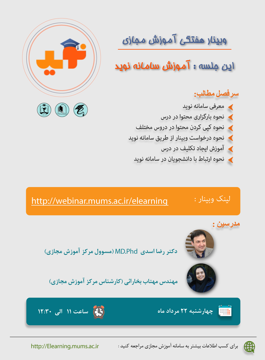 آموزش سامانه نوید چهارشنبه 15 مرداد 99 ساعت 11 تا 12:30 فیلم ضبط شده وبینار |