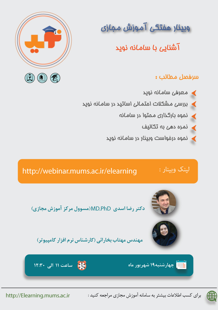 طراحی آزمون های الکترونیکی در سامانه نوید - ویژه اساتید بیمارستان اکبر چهارشنبه 19 شهریور 99 ساعت 11 تا 12:30