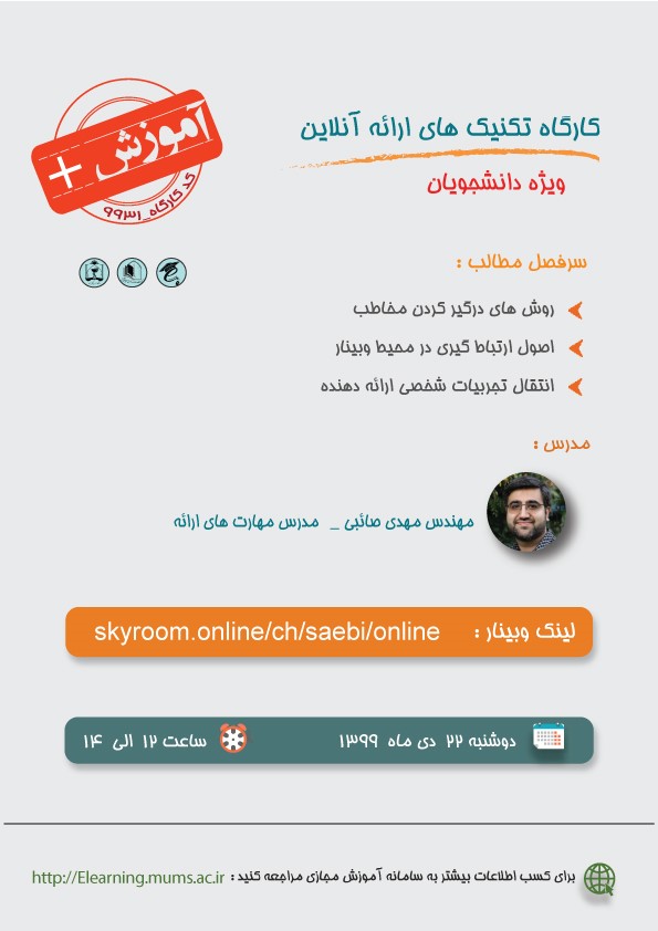کارگاههای برگزار شده 05 آذر 1399 09 دی 1399 بازدید: 857 امتیاز: ( 0 Rating ) کارگاه تکنیک های ارائه آنلاین امتیاز کاربران لطفا رای دهید رای 1 رای 2 رای 3 رای 4 رای 5 کارگاه تکنیک های ارائه آنلاین ویژه دانشجویان دوشنبه 22 دی ماه 99 ساعت 12 تا 14 لینک جلسه : Skyroom.online/ch/saebi/online قبلی بعدی